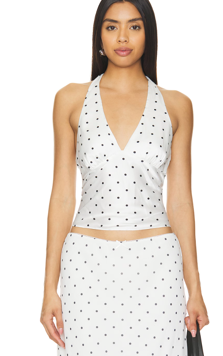 Nina incarne cette allure rétro qu’on aime sans condition. Un top à col bénitier, une jupe fluide taille basse, et ces petits pois blancs sur fond noir qui rappellent les icônes du vieux cinéma. Léger, espiègle, flatteur, ce duo se porte avec des lunettes noires et un petit sac baguette, pour flâner entre librairies et cafés.